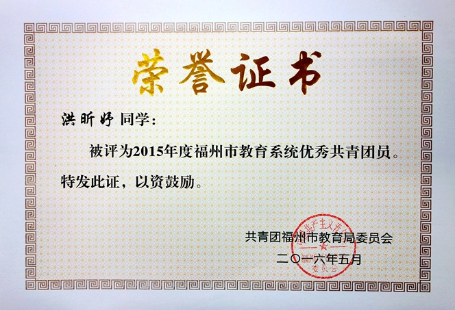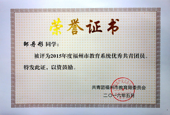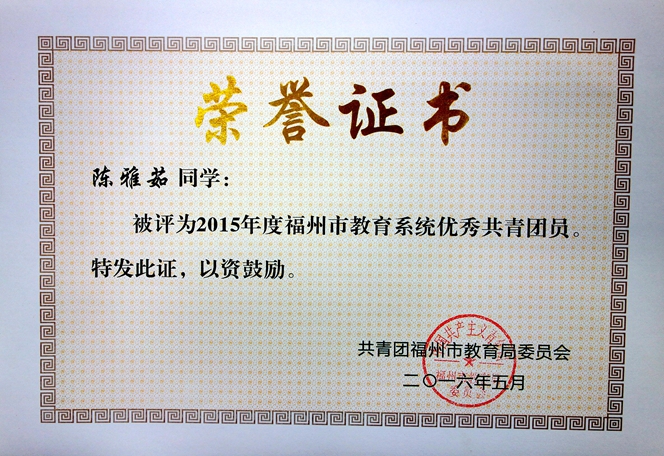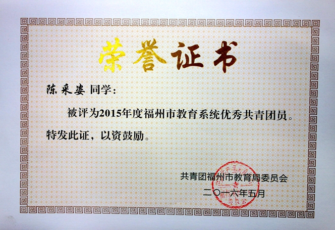经学校团委推荐申报,我校四个团支部获得2015年度“福州市教育系统先进团支部”荣誉称号;五名同学荣获2015年度“福州市教育系统优秀共青团团员”荣誉称号。