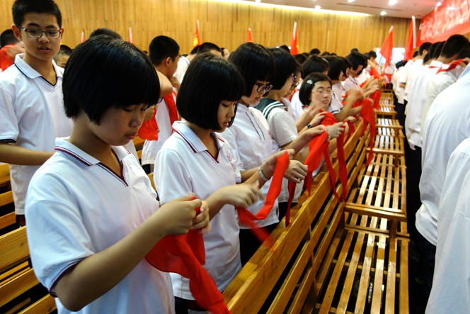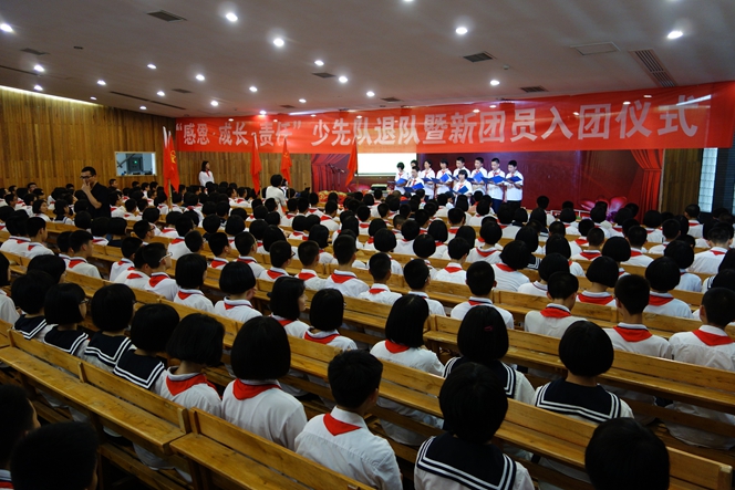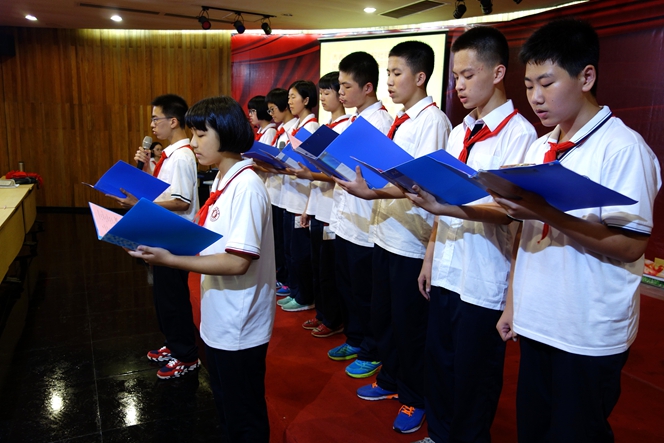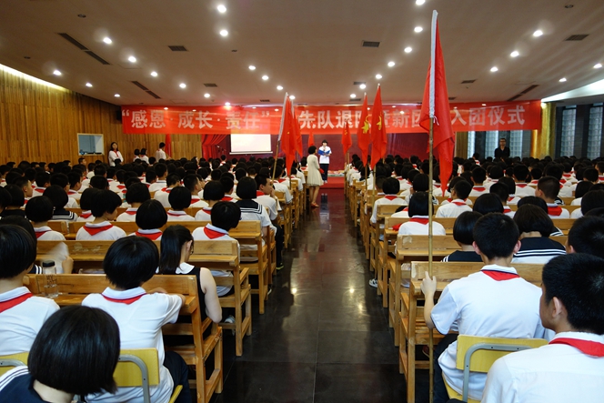 6月1日下午,初二年段全体少先队员在会议中心,隆重召开“感恩•成长•责任” 初二年段举行少先队退队仪式。活动开始大家唱队歌,敬队礼,活动中由初二年段10名班长朗诵《青春誓词》激励同学们让“青春无悔,让人生无憾!” 之后由初二(3)班范晓欢同代表优秀学生代表讲话。随后在团委陈锦霞老师的带领下全体少先队员做最后一次呼号,之后庄严地在国旗下摘下陪伴自己多年的红领巾,这意味着他们真的长大了。从此,他们更懂得担当,更有责任感,他们将像雄鹰一样飞向更高更蓝的天空至此他们成为真正的青年。活动最后俞校长对初二年段提出,“要懂得感恩;要为自己负责;要为爱你的人努力奋斗;用优良的品德和成绩充实自己成长时光。”的殷切期望。