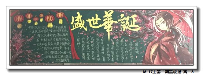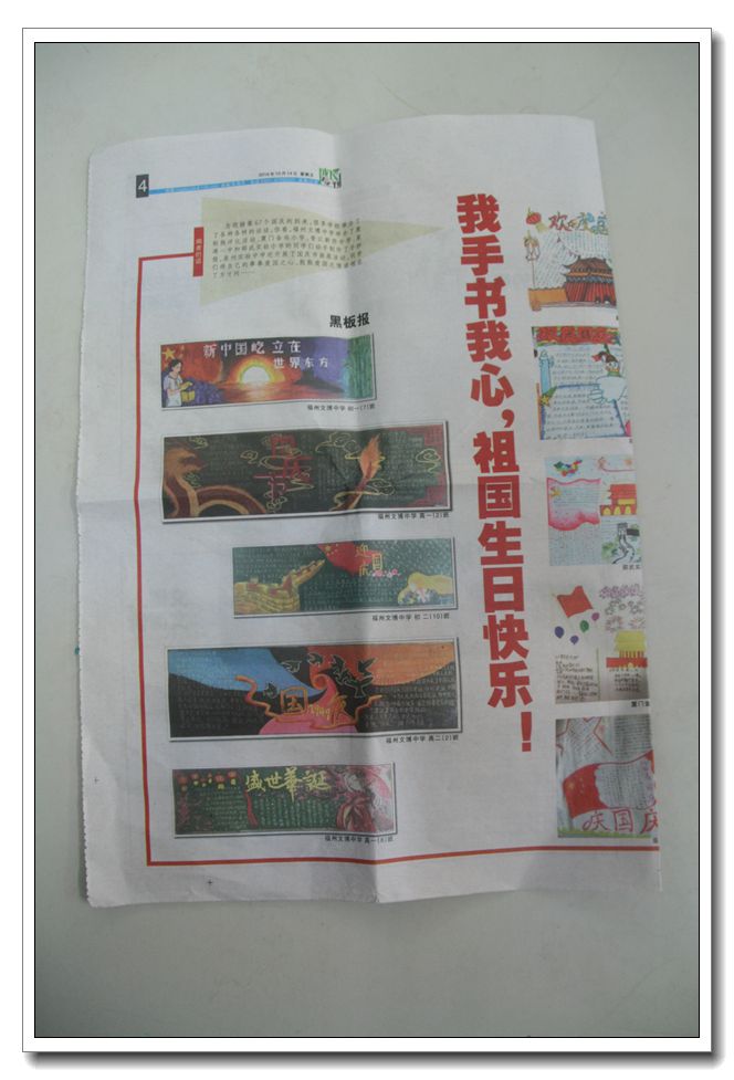 在2016年10月14日的海峡教育报上,刊登了我校本学期第二期部分迎国庆主题黑板报优秀作品。在班级宣传建设中,我校黑板报一直是重点和亮点。各班宣传委员以及同学们都很认真出好一个月一期的黑板报,不仅主题鲜明,且个性突出。以下为本次刊登在海峡教育报上的优秀作品: