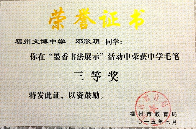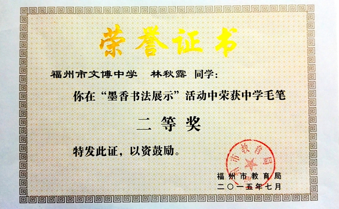 2015年七月,在“墨香书法展示”活动中,林秋露同学荣获中学组毛笔二等奖,邓欣月同学荣获中学组毛笔三等奖。