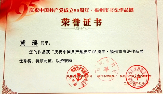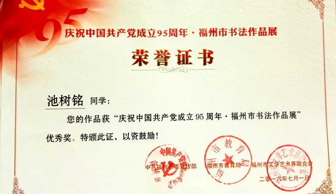 2016年7月庆祝中国共产党成立95周年,黄瑶(初三7)、张薇(初三6)、池树铭(初二8)获优秀奖,作品在于山福州画院展出