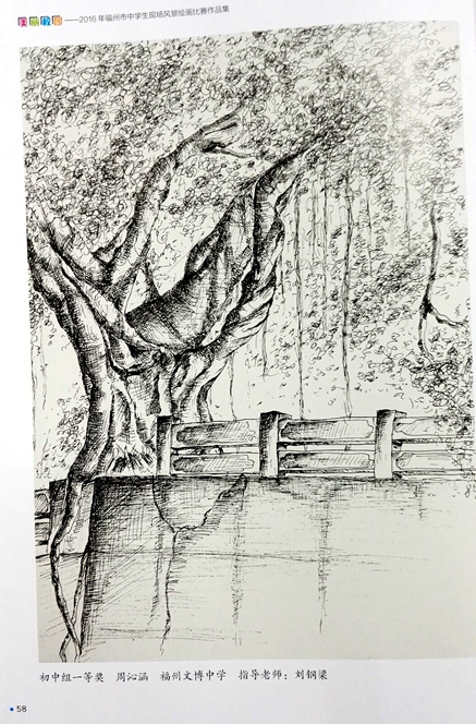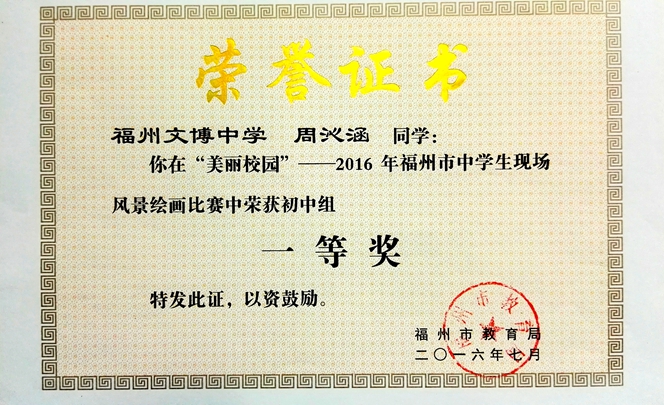 2016年7月,初三3周沁涵同学,在“美丽校园”--2016年福州市中学生现场风景绘画比赛中荣获初中组一等奖