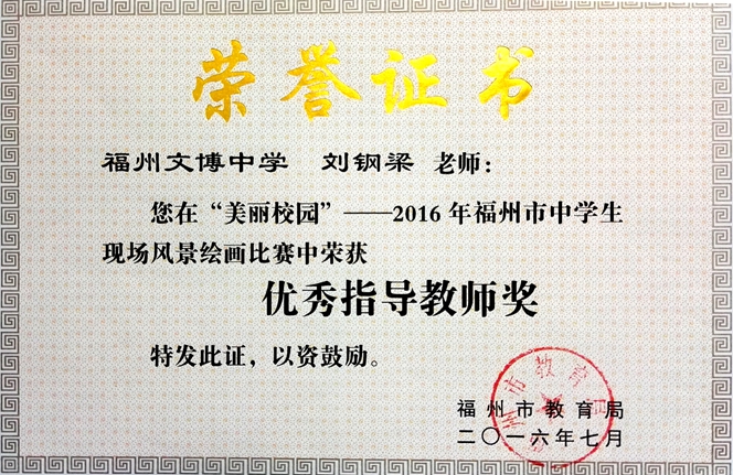 2016年7月,刘钢梁老师,在“美丽校园”--2016年福州市中学生现场风景绘画比赛中荣获优秀指导教师奖