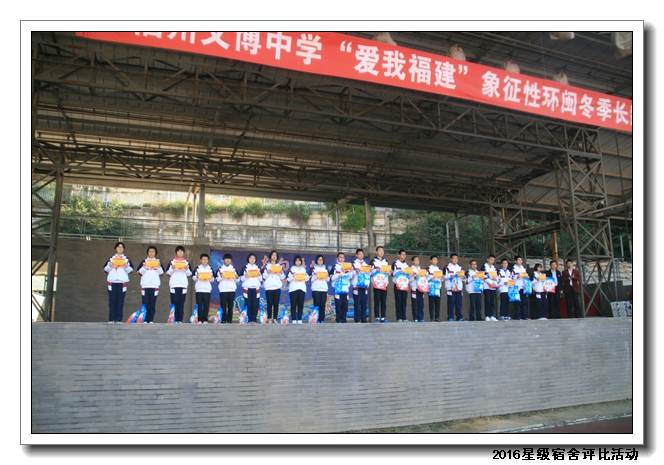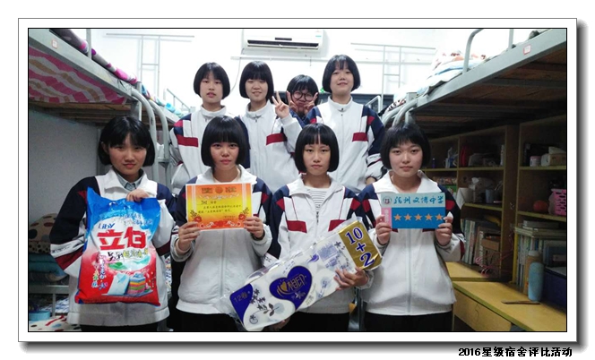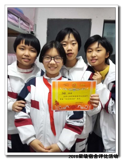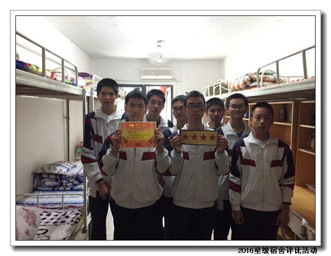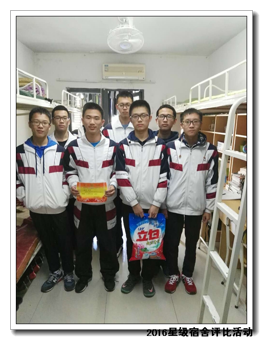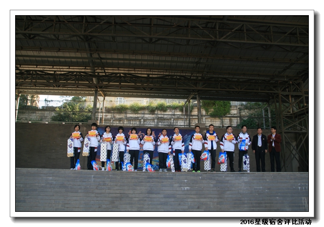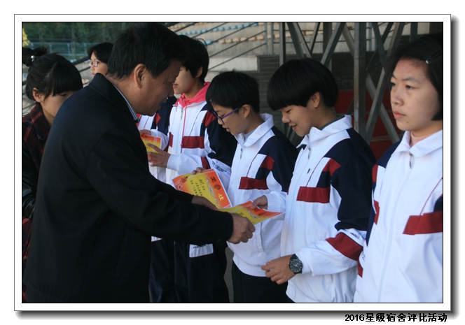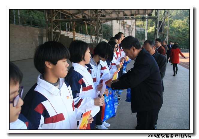经过校领导、年段长、德育处老师、学生评委等组成的评委团进行评比,共评选出53名星级宿舍,并在2016年12月14日课间操现场进行颁发奖状及奖品。