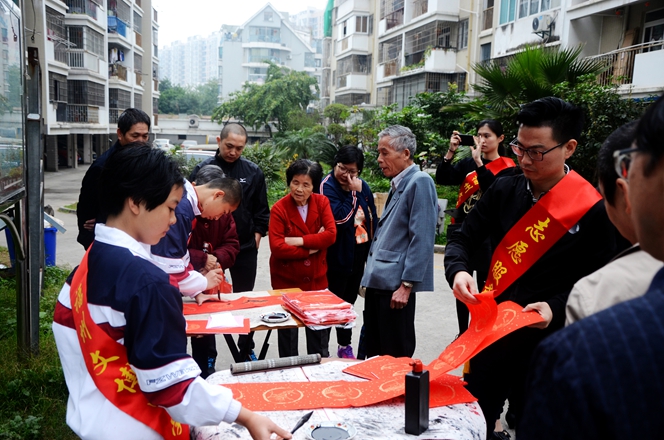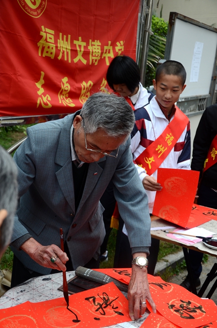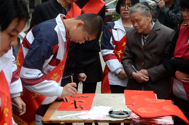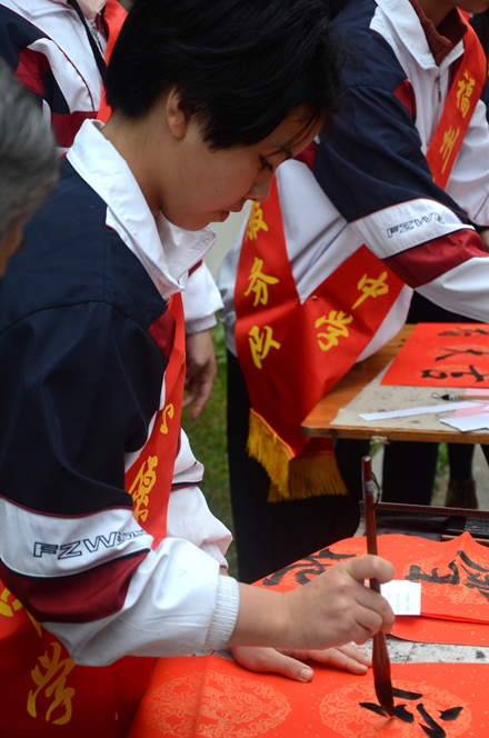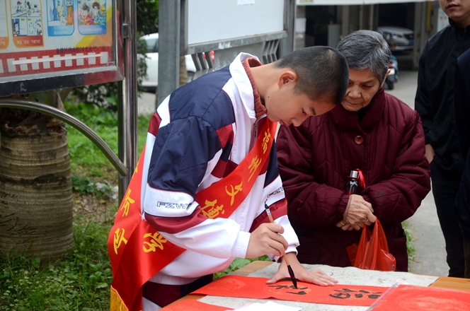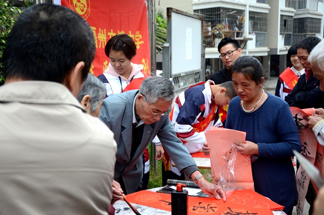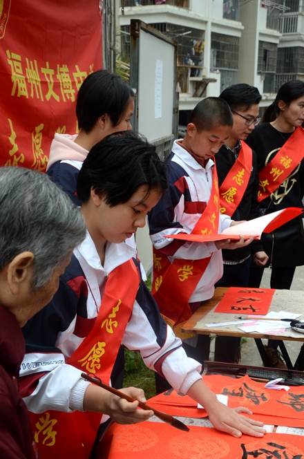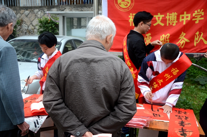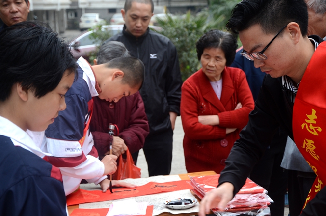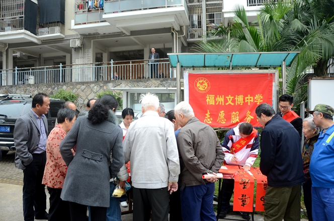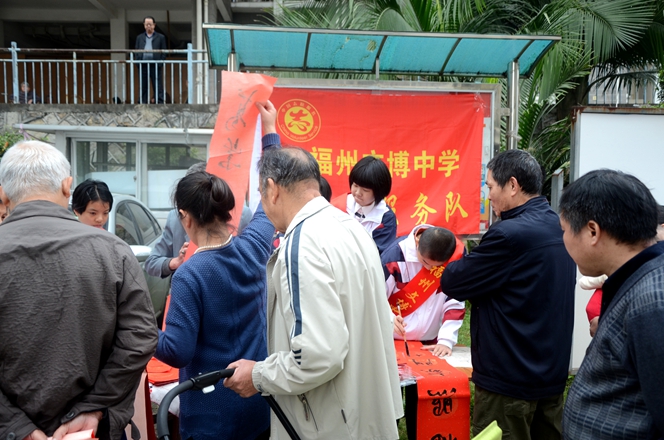 为大力弘扬“奉献、友爱、互助、进步”的志愿者服务精神,弘扬优秀传统春联民俗文化,展现我校志愿者服务队风采,我校党支部、团委会在2017年1月7日上午组织书法特长生开展了一次“有福之州 文明同行”迎新春写春联送祝福活动,让学生走进社区、走进居民、共迎新春。