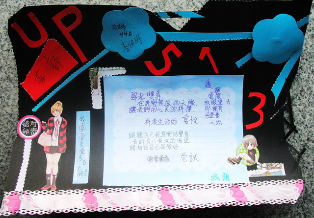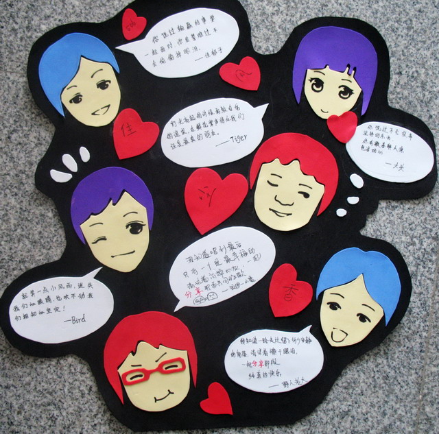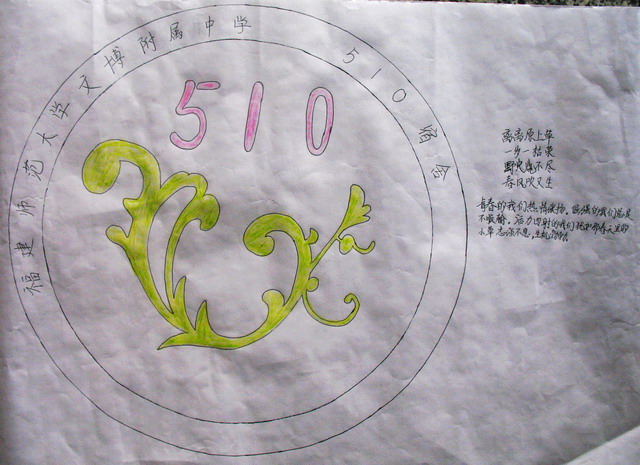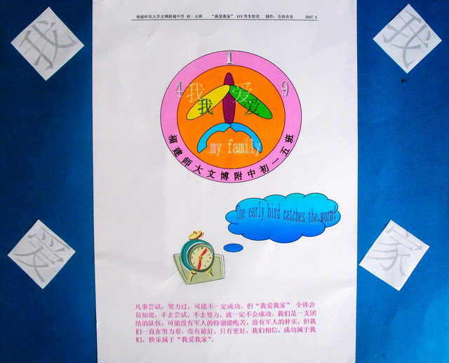 福建师范大学文博附属中学首届舍标大赛开始了!经过两个星期的充分准备,我们收到了三十几幅各具特色的作品,好些作品不仅创意无限,心灵手巧,还表达了舍员之间及同学们对学校的深厚感情!由学校领导、美术老师、生管组老师、学生会、团委会的同学们组成的评委团评选出了十幅作品,其中高一(6)班506宿舍高票获得第一名,高一(1)班的401及高一(6420分别获得第二名;初一(1)班409,初一(2)班518及高一(2502宿舍获得了第三名;501502511519宿舍的作品被选入pk台,让全校师生参与投票,继续接受挑战!这次活动不仅启发了同学们的智慧,充分展示了同学们的才华,更加深了同学们的感情及大家的爱校情结。 欢迎同学门新的作品不断涌现,迎接挑战,设计出更好的作品!
